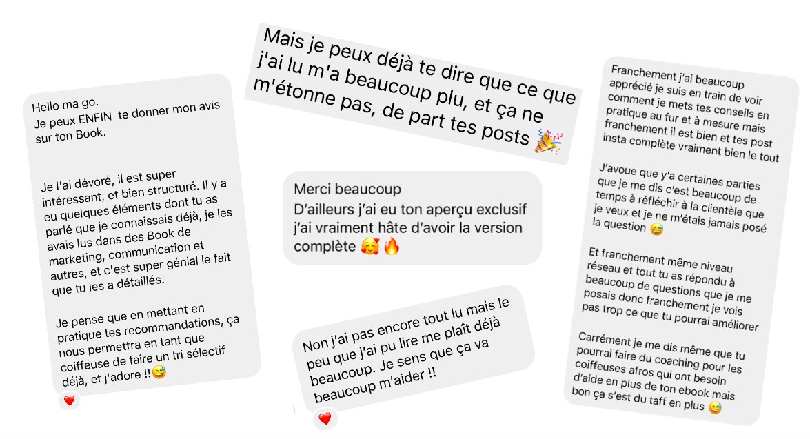 J'ai bossé à fond mes techniques de vente, marketing et communication pour optimiser mes conditions de travail. Aujourd'hui, ma prestation la moins cher est à 120€ et mes clientes payent en moyenne 180€ lors de leur passage chez moi ! Ça a révolutionné ma vie professionnelle et aujourd'hui j'ai décidé de partager ces clés avec vous.